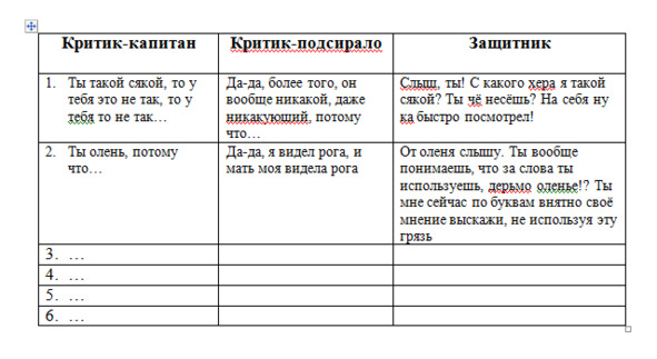 1. Начинает Критик-капитан, и выскажет тебе все свои претензии. По форме: «Ты такой сякой, то у тебя это не так, то у тебя то не так…». Пусть использует любые даже самые обидные слова. Следует писать претензии до тех пор, пока не почувствуешь обиду за себя. ⠀