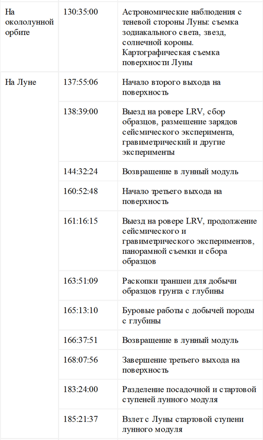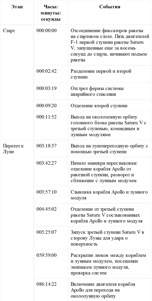 Перед обсуждением лунной программы стоит вспомнить, на какие этапы подразделялась каждая экспедиция на Луну и как они проходили. Рассмотрим самый длительный полет – Apollo 17. Последние три экспедиции Apollo были сложнее предыдущих из-за большего набора инструментов и приборов и более сложной научной программы, но схема полета и основные этапы были те же.