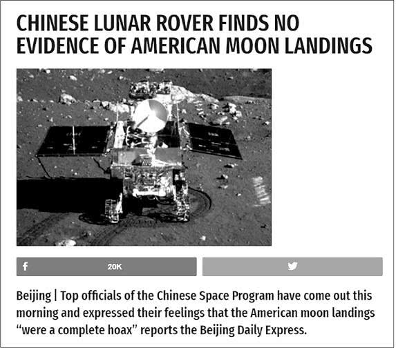 Новость же о том, что китайский луноход не нашел следов присутствия американцев на Луне, появилась на юмористическом сайте «фейковых», т. е. выдуманных, новостей World News Daily Report. Предупреждение, размещенное в нижней части этого сайта, гласит: «Мы принимаем на себя всю ответственность за сатирический характер своих статей и за вымышленный характер их содержания. Все персонажи, появляющиеся в статьях на этом сайте, даже те, которые основаны на реальных людях, являются вымышленными, и любое сходство между ними и любым человеком, живым, мертвым или зомби, является просто чудом».
