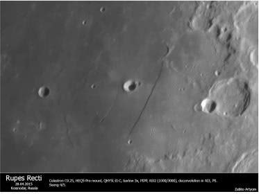 Переместимся южнее, в восточную часть Моря Облаков. Когда фаза Луны составляет примерно 8 дней после новолуния, наблюдатель без труда отыщет Прямую Стену – самый известный тектонический разлом на поверхности Луны. Выглядит он как длинная и тонкая линия, простирающаяся с севера на юг почти на 120 км. Можно заметить, что не такая уж «стена» и прямая: на обоих ее концах имеются сегменты, расположенные под углом. Да и отвесной ее назвать нельзя, так как наклон склона составляет примерно 21 градус.