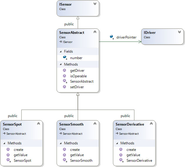 В строке 1 объявлен метод для инициализации драйвера. В строке 2 объявлен метод для активации датчика. В строке 3 объявлен метод, возвращающий признак работоспособности датчика. В строках 4, 5 и 6 объявлены методы для чтения соответственно текущих, сглаженных и производных значений. Метод в строке 7 представляет собой фабрику классов, в котором происходит создание класса соответствующего типа.