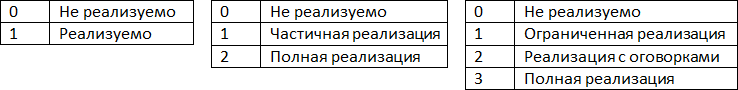 По своей сути метод интегральных оценок повторяет качественный анализ, но с одним отличием – в матрице соответствия вместо качественных вводятся количественные оценки. В ячейках матрицы проставляются числовые значения, отражающие, насколько объект анализа поддерживает (другими словами, в какой степени реализует) соответствующее требование. Диапазон возможных значений задается шкалой оценок, которая зависит от точности, которую мы хотим получить. Примеры различных шкал оценок изображены на Рис. 16.