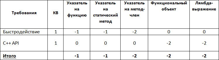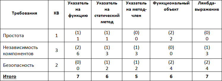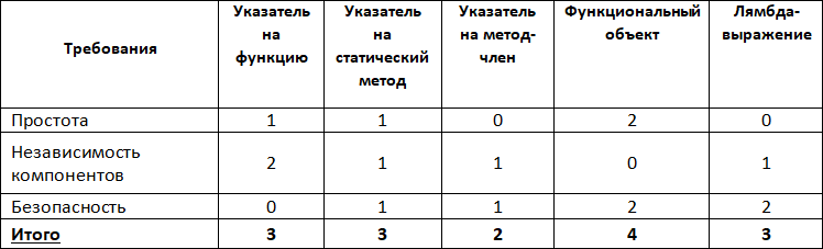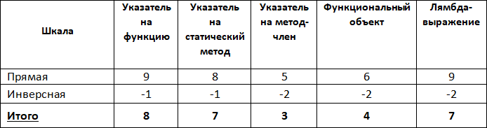 Как видим, после введения коэффициентов важности результаты изменились: теперь максимальное количество балов набирают две реализации – указатель на функцию и лямбда-выражение.