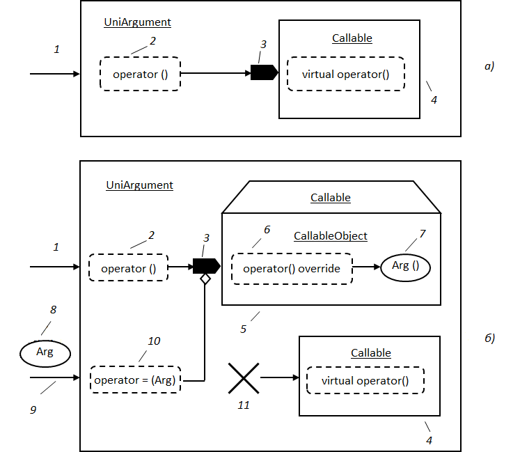 Графическое изображение стирания типов изображено на Рис. 17. Рассмотрим начальное состояние а), показанное в верхней части рисунка. Имеется некоторый класс, назовем его UniArgument. В этом классе объявлен перегруженный оператор вызова функции 2. Также здесь имеется указатель 3 типа Callable*, который указывает на соответствующий экземпляр класса Callable. Класс Callable 4 объявлен внутри UniArgument и имеет виртуальный перегруженный оператор вызова функции с пустой реализацией.