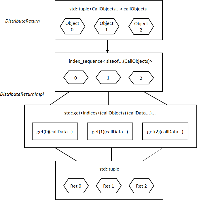 В строке 1 объявлен шаблон вспомогательной функции, параметрами шаблона выступают пакет объектов вызова CallObjects, пакет индексов Indices и пакет данных вызова CallData. Сама функция объявлена в строке 2, ее входными параметрами являются: кортеж вызываемых объектов, параметризованный пакетом объектов вызова; последовательность индексов, параметризованная пакетом индексов; пакет данных вызова. Данная функция возвращает кортеж, сформированный по результатам вызова. Для получения элемента кортежа используется вызов std::get, на вход которому передается индекс элемента, и затем происходит вызов полученного элемента, на вход которому передаются данные callData. А поскольку вместо конкретного индекса мы используем последовательность индексов, она будет развернута в набор вызовов get с соответствующими индексами, таким образом, осуществляя вызовы для все элементов кортежа в соответствии с их индексами. Графически рассмотренная операция для трех объектов изображена на Рис. 23.