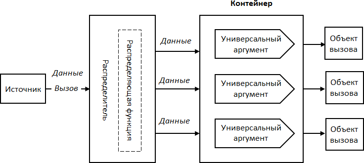 Итак, поскольку количество объектов заранее не определено, для их хранения необходим динамический контейнер. Однако он не может хранить объекты непосредственно, поскольку они могут иметь разные типы, а динамический контейнер работает с данными одного строго определенного типа. Выходом будет хранить универсальные аргументы, а уже в них сохранять объекты вызова. Структурная схема изображена на Рис. 24.