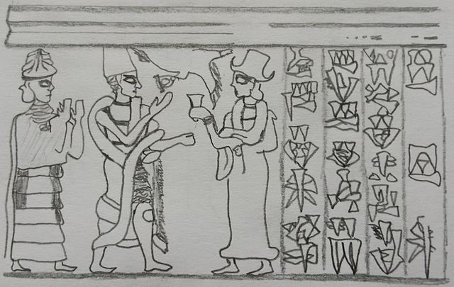 Оказывается, жена и наложницы правителя Ямхада на могли разродиться, – становится понятным, почему он решает очень быстро уладить конфликт. Авраам принимает извинения, молится за него, и с Абба-Эля снимается проклятие, и у него рождаются дети. Конечно, такое событие не могло остаться неувековеченным. Обратим внимание на печать Абба-Эля, найденную археологами и дошедшую до наших дней. На ней мы видим слева направо женщину в вавилонских одеждах; мужчину, над которым летит птица, держащая анх – символ жизни (напомним, что имя Аврам происходит от аккадского слова abramu и означает ‘птица’), и Абба-Эль, царь Ямхада, протягивает чашу Аврааму в знак дружбы и расположения. Не нужно много фантазии, чтобы понять, о чем здесь речь.
