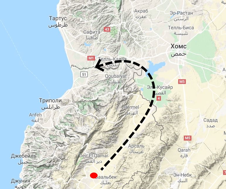Пошел он по пути своему от истоков Оронта до Дома Б-га на место где остановился он вначале между Домом Б-га и развалинами