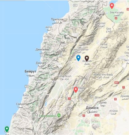 На карте красными точками обозначены город Кадеш и озеро Бараду. Между ними берет свое начало река Литани (синий маркер) и впадает в Средиземное море севернее Тира, или Сура, обозначенного зеленым маркером. Где-то в районе истоков реки Литани нашел Агарь Ангел Б-га.