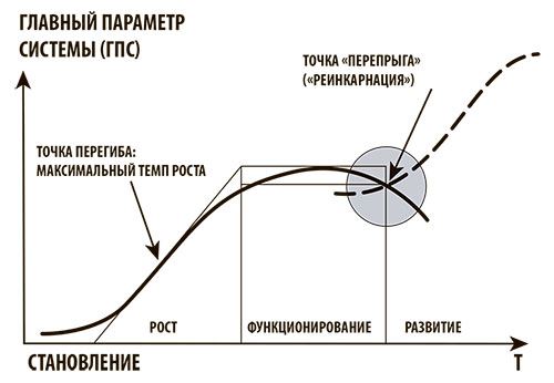● На графике жизненного цикла точка «перегиба» – зона максимального роста, а зона развития – в точке бифуркации (развилке) в правой части рисунка.