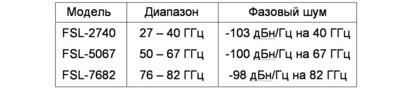 В итоге общая структура синтезатора существенно усложняется. Она реализована на практике в линейке синтезаторов типа QuickSyn фирмы Phase Matrix, ныне в составе National Instruments (см. те же, приведенные выше ссылки на источники), где показала очень высокие характеристики спектральной чистоты. В модели QuickSyn Lite FSW-0010, обеспечивающей диапазон от 0,5 до 10 ГГц, «полка» шума на частоте сигнала порядка 10 ГГц в полосе ФАПЧ составляет около -120 дБн/Гц, а уровень дискретных компонентов менее -70 дБн и время переключения порядка десятков микросекунд. В следующей модели – FSW-0020 – диапазон частот расширен до 20 ГГц, и на её базе создан ряд синтезаторов миллиметрового диапазона, характеристики которых приведены в Табл.3. При этом во всех приведенных модификациях шаг сетки частот равен 1 Гц, паразитные спектральные составляющие не превышают -60 дБн и время переключения частоты не более 1 мс.