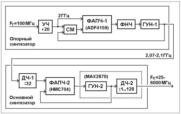 Так же и в блоке основного синтезатора могут быть использованы экономичные недорогие серийные микросхемы: HMC704 от Hittite (ФАПЧ-2) и MAX2870 от Maxim Integrated (ГУН-2 и ДЧ-2).