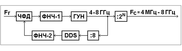 DDS в этой схеме выполняет роль делителя частоты с переменным коэффициентом деления (ДПКД). Он тактируется поделённой в 8 раз частотой в октавном диапазоне 4÷8 ГГц, поступающей от ГУН. Коэффициент деления DDS, как делителя частоты, также перестраивается в октавном диапазоне в соответствии с октавным частотным диапазоном 0,5÷1 ГГц на его входе. Таким образом, частота на выходе DDS остаётся постоянной и равной опорной частоте Fr (при наличии синхронизма в петле).