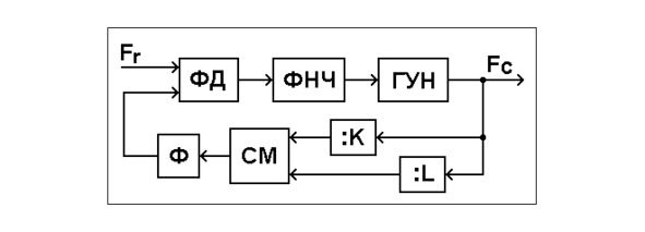 Согласно со структурой схемы выходная частота Fc синтезатора определяется выражением