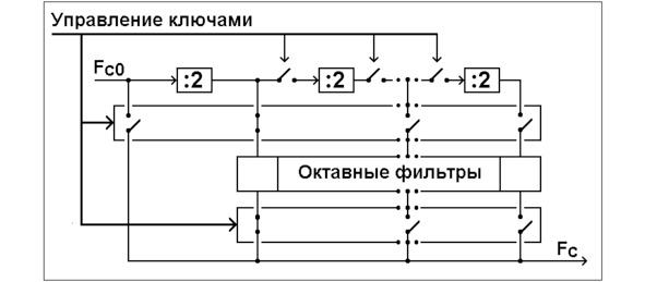 На рисунке показан пример получения диапазона частот Fc=FС0/2, где FС0 – исходный октавный диапазон. Чтобы избежать попадания в спектр сигнала Fc её субгармоник, последующие делители частоты, после используемых, отключаются. В качестве делителей частоты целесообразно использовать триггеры с выходным напряжением в виде меандра, не содержащим второй гармоники. Поэтому синусоидальный сигнал на выходе Fc может быть получен с помощью довольно простых фильтров нижних частот октавного диапазона.