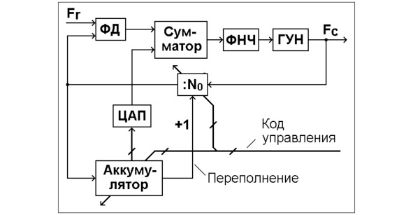 ДДПКД представлен в виде целочисленной части с коэффициентом деления N0 и дробной части, выполненной на аккумуляторе (накапливающем сумматоре). Импульс переполнения последнего передаётся в целочисленную часть, и общий коэффициент деления увеличивается при этом на единицу, из-за чего и возникает помеха дробности.
