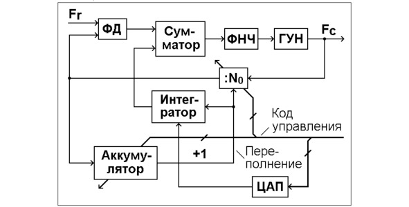 Каждое переполнение аккумулятора вызывает скачёк частоты на выходе делителя частоты. Чтобы его скомпенсировать, необходимо создать сигнал, соответствующий получаемому при этом отклонению фазы, и сложить его в противофазе с напряжением на выходе фазового детектора. Для этого и служит интегратор. Он может быть выполнен на базе операционного усилителя.