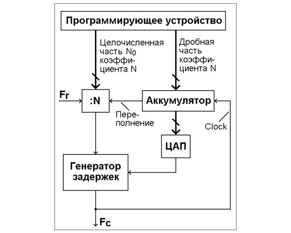 Схема представлена на рисунке 15. Она содержит программирующее устройство для задания целочисленной и дробной частей коэффициента N, поглощающий счётчик (обозначен на схеме как: N), аккумулятор для формирования дробной части коэффициента деления и генератор задержек, управляемый цифро-аналоговым преобразователем (ЦАП). Поглощающий счётчик тактируется импульсами опорной частоты Fr, а аккумулятор – сигнальными импульсами частоты Fc. Поглощающий счётчик вместе с аккумулятором образуют, в целом, схему ДДПКД.