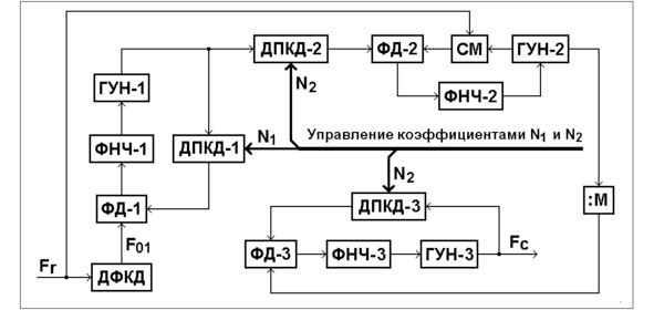Идея, предложенная автором, отличается особым способом построением ДДПКД в петле ФАПЧ [37]. Схема синтезатора частоты, в которой используется эта идея, показана на рисунке 11.