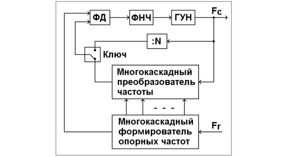 После этого включается в работу вторая петля. Она действует через многокаскадный преобразователь частоты в цепи обратной связи. Преобразователь частоты содержит последовательно включённые смесители частоты, в которых в результате взаимодействия с опорными частотами происходит смещение частоты сигнала вниз к частоте сравнения в ФД. Опорная частота для каждого последующего каскада понижается с помощью многокаскадного формирователя опорных частот, состоящего из набора делителей, умножителей и смесителей частоты. Этот блок работает от сравнительно высокочастотного опорного источника частоты Fr. Здесь, можно сказать, просматривается аналогия с обычным аналоговым синтезатором с той лишь разницей, что преобразование частоты происходит вниз, а не вверх. Выход последнего каскада формирователя опорных частот служит также опорой для обеих петель ФАПЧ.