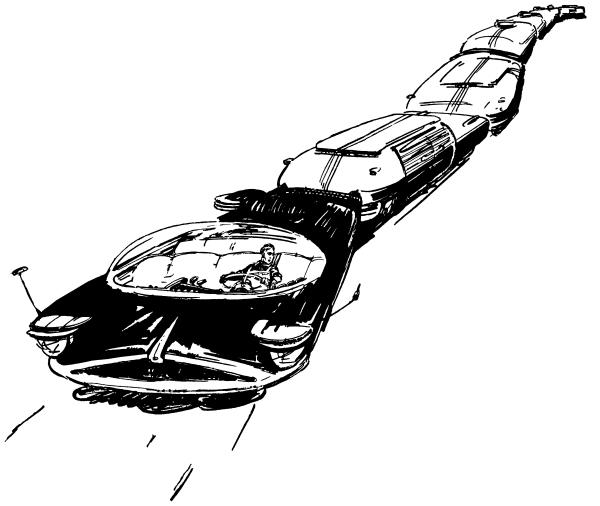 В это время издалека донёсся ровный тяжёлый гул и из-за поворота показалась странная машина. Очень широкая, гораздо ниже и гораздо шире даже двадцатипятитонных самосвалов, она мчалась с невероятной скоростью. Впереди, в блестящей прозрачной кабине, сидел шофёр. Сзади машины тянулся целый поезд длинных, таких же низеньких и широких прицепов.