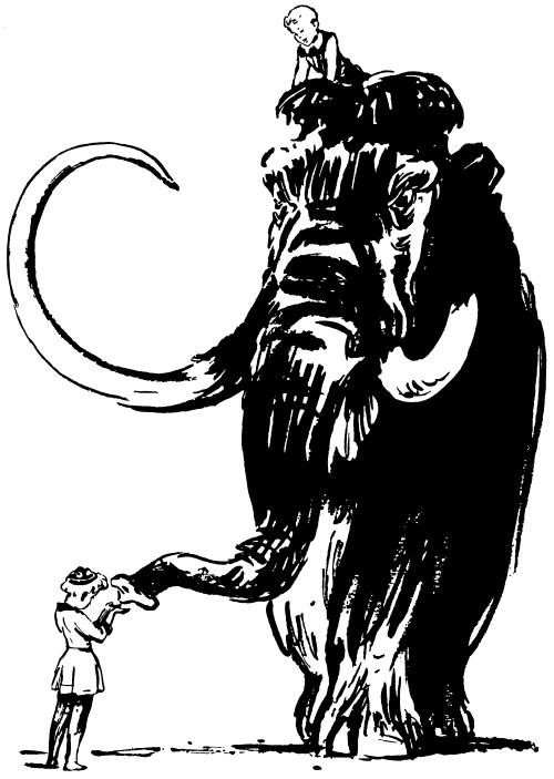 Этого ещё недоставало! Да и как ему скажешь? Ведь Вася ещё не окончательно разработал технику обращения с мамонтом. Но девочка, не дожидаясь его согласия, сразу же стала цепляться за мамонтову шерсть. И Тузик вдруг склонился на одно колено и осторожно, заботливо подсадил Лену хоботом. Вот что значит сахар.