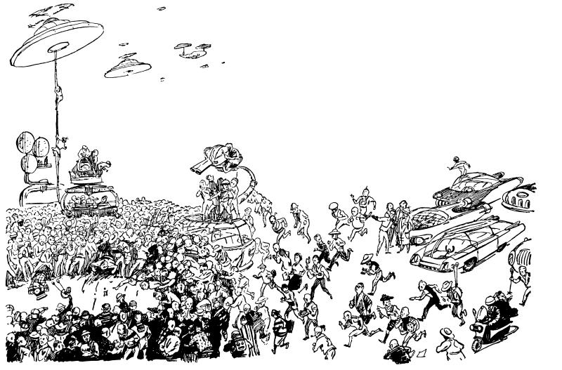 Вскоре гостей несколько оттеснили работники телевизионных центров, установившие свою аппаратуру, и кинооператоры. А тут, как назло, стали слетаться опоздавшие гости, и над головой то и дело шумели вертолёты. У любого человека от этого шума и пестроты разболится голова, а если он ещё спал кое-как, то даже разговаривать и то не захочется.