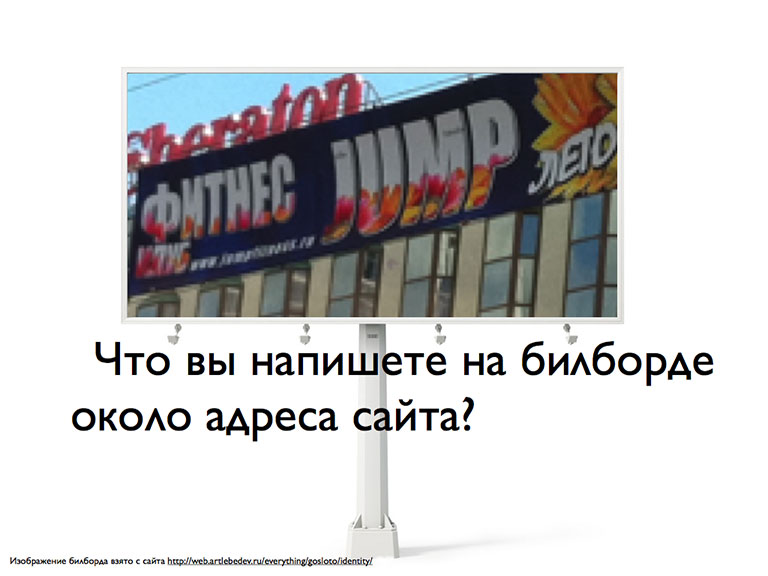 Представьте, что вам нужно дать рекламу на билборде рядом с каким-нибудь шоссе. Рядом с адресом сайта вам нужно написать одну причину для его посещения. Нечто полезное для посетителя. В одной фразе. Что вы напишете?