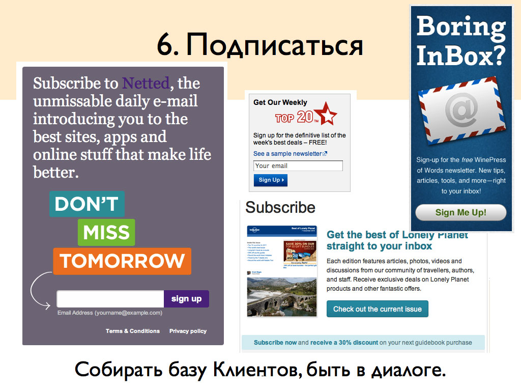 5. Рассылка. Если вы вызвали доверие у теплого лида и уже немного помогли ему в решении его проблемы, было бы неплохо превратить этого посетителя в подписчика. Да-да, сделать так, чтобы он получал e-mail-рассылку (не спам!), и да, он будет ее читать. Обо всем в соответствующих главах.