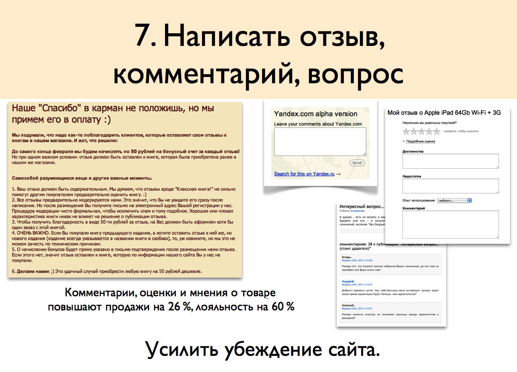 Мотивировать можно по-разному: от выплаты за отзыв или комментарий бонусных рублей, которые можно потратить на оплату вашего товара, до конкурса на лучший комментарий.