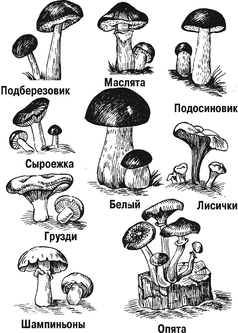 ГрибыСыроежки (только красные можно есть даже в сыром виде) – коричневая, красная или желтоватая шляпка, края которой приподняты вверх. Ножка короткая и белая.