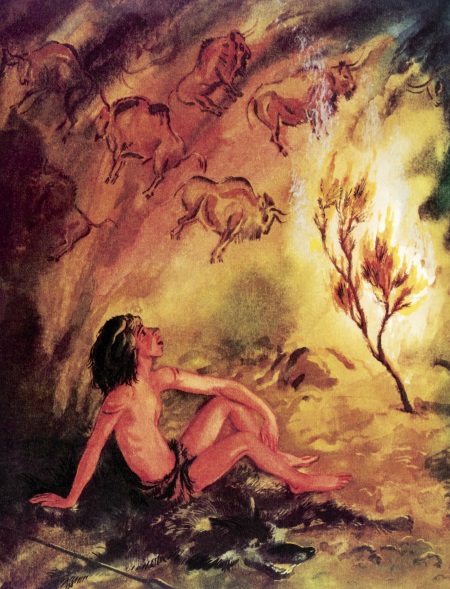 Старик ушёл, а мальчик взял факел и стал рассматривать рисунки.