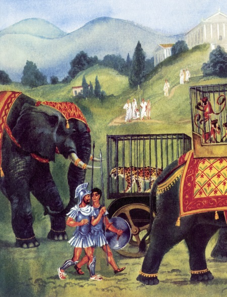 …Однажды утром афиняне испугались, услышав в гавани грозный рёв. Может быть, это напали враги? Отовсюду бежали люди – кто с мечом, кто с копьём. Но, выбежав на дорогу, ведущую к морю, они изумлённо останавливались. Навстречу им шли огромные серые чудовища, похожие на движущиеся горы. То одно, то другое поднимало кверху похожий на трубу хобот и гулко трубило. Рядом шагали воины, смеясь над испугом афинян.