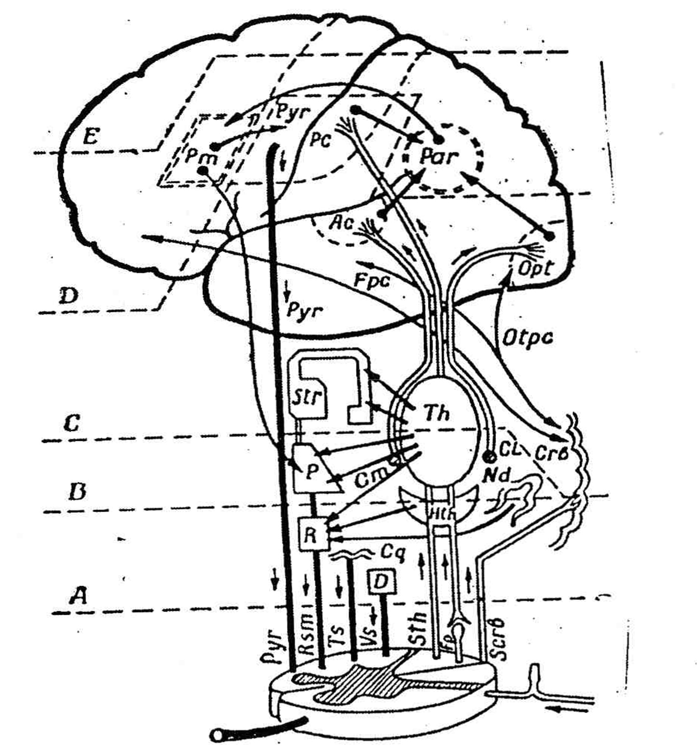 Для иллюстрации этого приводится на рисунке 1 схема, взаимствованная из книги Н.А.Бернштейна «О построении движений» (1947). Как показано на схеме, из мозга на периферию ведут: пирамидный путь (Pyr), начинающийся в высших отделах, и группа экстрапирамидных (Rsm – руброспинальный, Ts – тектоспинальный, Vs – вестибулоспинальный), начинающихся в низших отделах; из периферии к центру идет только одна группа путей (Sth – спиноталамический, Fp – заднестолбовой, (Scrb – спиноцеребральный), они заканчиваются в низших отделах. Пути Fpc – фронтопонтоцеребелярный и затылочновисочнопонтоцеребелярный соединяют верхние отделы мозга с мозжечком. Одновременно на схеме приведено возможное распределение основных ядер мозга по уровням: R – красное ядро; D – ядро Дейтерса; Cq – четверохолмие; Hth – гипоталамус; Nd – зубчатое ядро; P – паллидум; Cm – внутреннее и Cl – наружное коленчатое тело; Crb – кора мозжечка; Str – стриатум; Th – зрительный бугор; Pm – премоторная зона коры; Pyr – пирамидная область; Pc – постцентральная извилина; Ac – слуховая зона; Opt – зрительная зона; Par – теменная область. Стрелками обозначены связи между отдельными ядрами, пунктирными линиями отмечено возможное расположение уровней управления движениями.