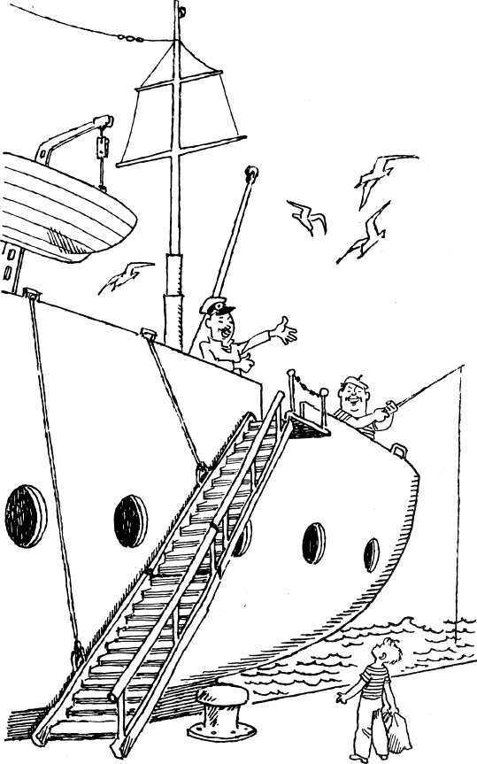 – Идём, Солнышкин, со мной, идём! – Здоровяк, как полководец, указал пальцем на пароход. – И ты поймёшь, что есть ещё на свете морская жизнь и есть на океане настоящие моряки!