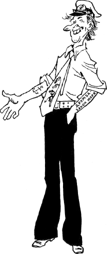 – Разве это моряки? От их парохода даже компотом не пахнет. А как они принимают товарищей? Разве они что-нибудь понимают в морской дружбе?! – презрительно усмехнулся детина и положил Солнышкину на плечо руку. На ней синими буквами было написано: «Дружба – закон моря».