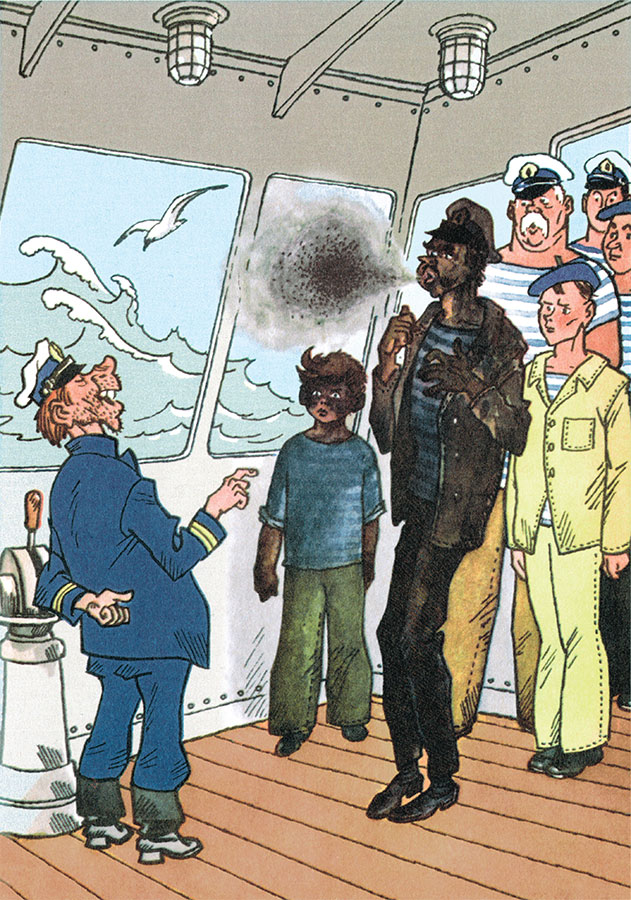 Они распахнули дверь рубки, по которой всё ещё ходил Плавали-Знаем. Капитан остановился, посмотрел на них и вдруг выкатил глаза: