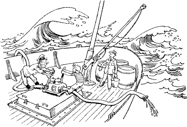 И Плавали-Знаем с криком «Аврал!» бросился вниз по трапу. Следом мчалась палубная команда и машинисты. Солнышкин тоже выскочил из каюты и, падая, на четвереньках пустился за капитаном. Судну угрожала опасность! Начинался первый аврал в его жизни, и ему хотелось настоящей морской работы. Едва помпу вытащили на трюм, Солнышкин сразу же ухватился за рукоятку.