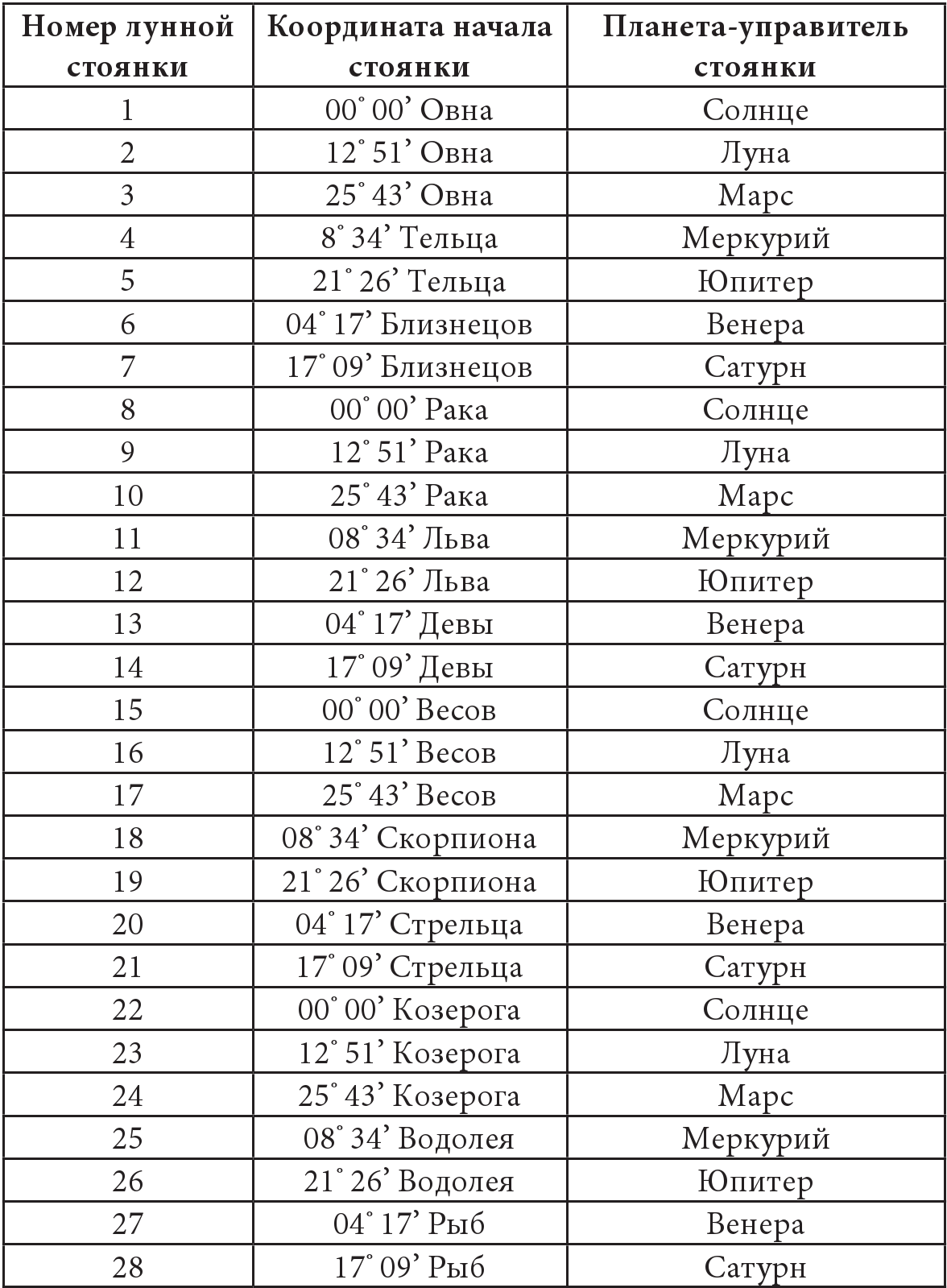 Длина каждой стоянки равна 12 градусам 51 минуте, что близко к среднему суточному движению Луны. Здесь вместо конкретных рекомендованных действий приведена планета-управитель каждой стоянки. Её символизм и определяет характер рекомендованных действий.