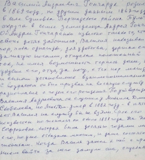 Жил привычной жизнью обычного сельского жителя. В нашей семье никогда не произносилась фамилия Гончаренко. Дед Гончарук, слышали неоднократно, но Гончаренко никогда.