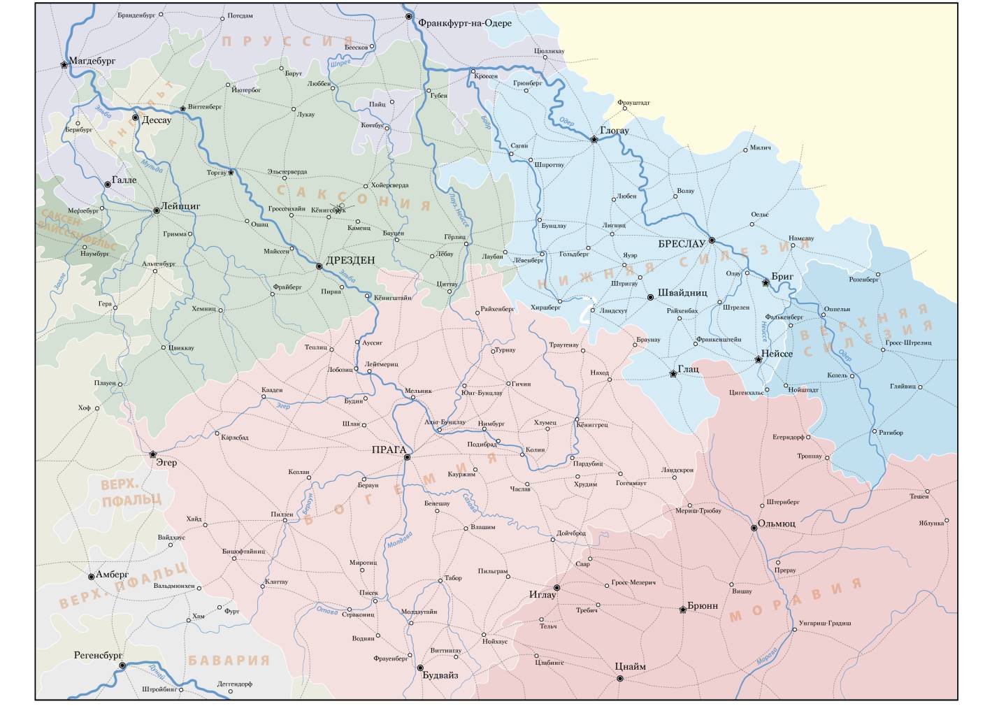 После того, как мы познакомили читателя с составом и численностью войск короля Пруссии, уделим немного времени театру военных действий, где предстояло оперировать армиям противников. Провинция Богемия, самая богатая из наследных габсбургских земель, отделена от Саксонского курфюршества и Силезии горами Эрца (Рудными) и Судет. Большие массы войск, разумеется, могли преодолеть эти горы лишь по дорогам. Интенсивная торговля между Богемией и Саксонией способствовала развитию дорожной сети. Войска в основном использовали почтовые дороги, имевшие ширину до десяти метров. Через горы Эрца между Карлсбадом (Karlsbad, Карловы Вары) и Ауссигом (Aussig, Усти-над-Лабем) вело шесть таких дорог. Однако, как часто бывало в те времена, все они находились в очень плохом состоянии, так что для преодоления гор Эрца приходилось затратить немало усилий. Зимой эти дороги были часто завалены снегом и непроходимы вплоть до поздней весны. Для нашего повествования особенно важна северная дорога, ведущая от Пирны и Кёнигштайна через Пашкополе (Paschkopole) к Эльбе у Лобозица (Lobositz, совр. Ловосице). Вдоль Эльбы дороги на этом участке в те времена ещё не было. Также оживлённое сообщение происходило тогда между Богемией и Саксонским Лаузицем, куда вели несколько дорог, главная из которых шла через Циттау и Брандайз на Прагу.