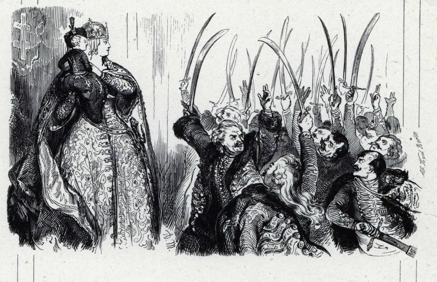 А. Менцель. Мария-Терезия с маленьким сыном Иосифом на руках перед венгерскими дворянами на сейме в Пресбурге.