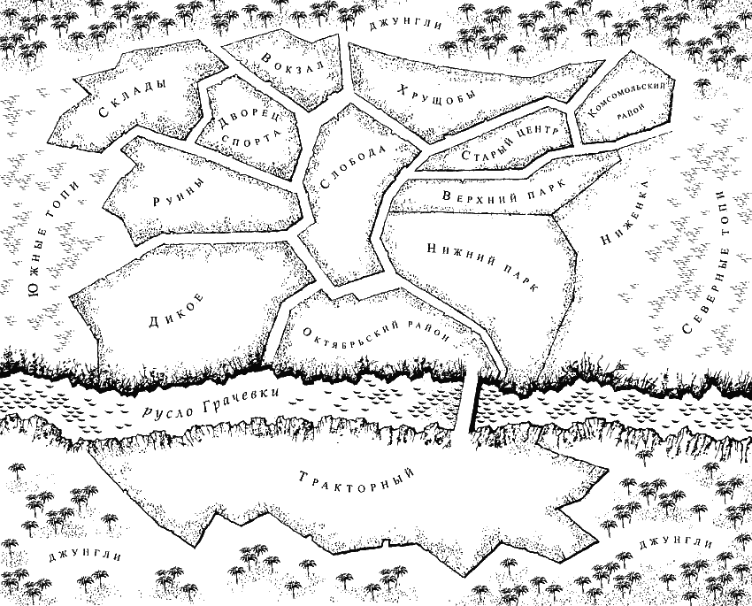 Кирпичные пятиэтажки, теперь словно вырубленные из цельных скал, непонятным образом соединившиеся друг с другом дома, неизвестно откуда возникшие холмы и овраги. Пешеходный светофор, нелепо валяющийся посреди островка праздничной зелени, и пропавшие фонарные столбы…