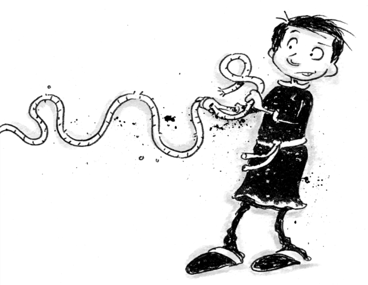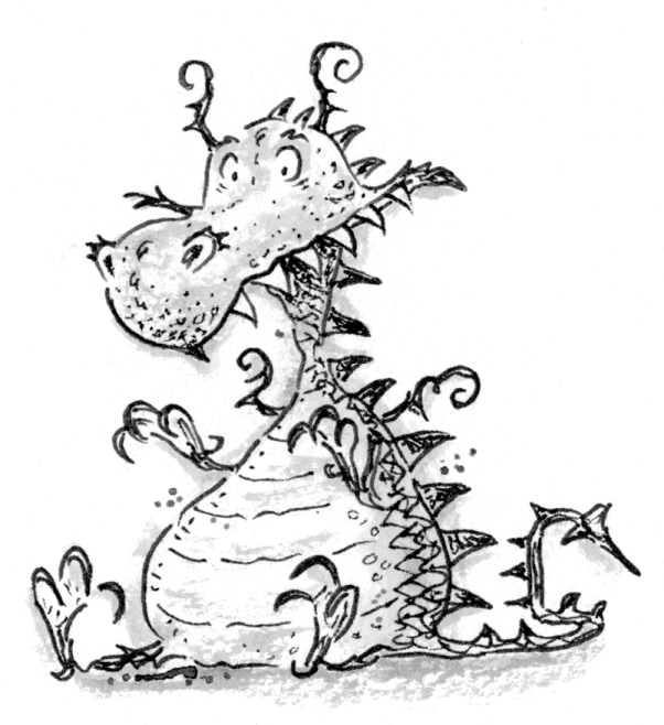 Сэм вздохнул и наклонился, чтобы всмотреться в колодец. Внизу было темно, и сперва он ничего не увидел, но постепенно начал различать островки травы и мутную воду. Ни намёка на Годфри. Сэм всё вглядывался и вдруг услышал, как кто-то негромко чихнул. Сэм сильнее перевесился через бортик и тут увидел малыша-дракона: в стене колодца недоставало кирпичей, и беглец ютился в образовавшемся углублении, только хвост не помещался и свисал наружу.