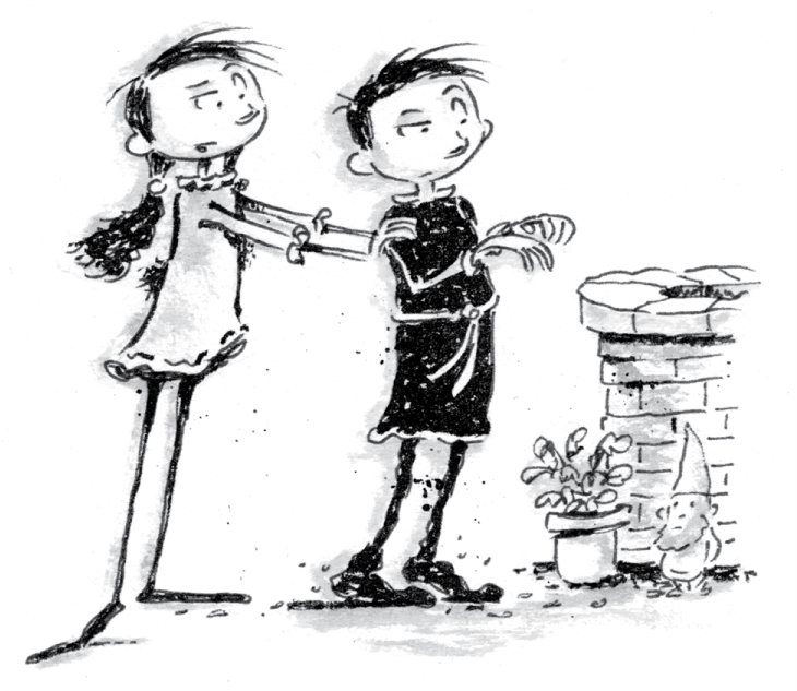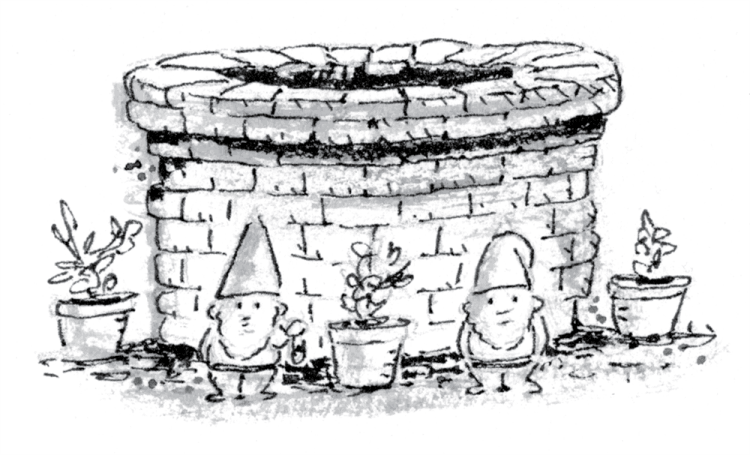 Вокруг колодца тётя Эгг расставила горшки с геранью и дельфиниумом, а также садовые фигурки весёлых гномов. Тёте нравилось думать, что сад у неё оформлен со вкусом и обладает художественными достоинствами (об этих достоинствах толковали все брошюры). И тётя вовсе не обрадовалась бы, увидев, как её собственная дочь бесцеремонно отодвинула пару горшков и отпихнула гнома в сторону, чтобы подойти к колодцу поближе.