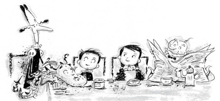 Тётя Эглантина занималась с маленьким драконом: она пыталась научить его сидеть за столом. Дело шло туго.