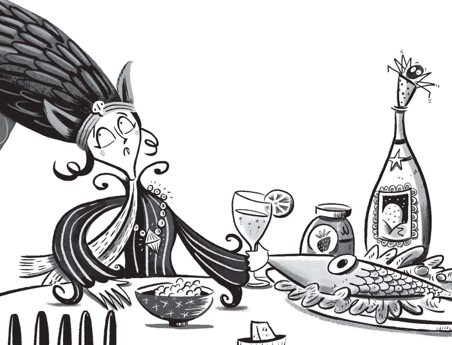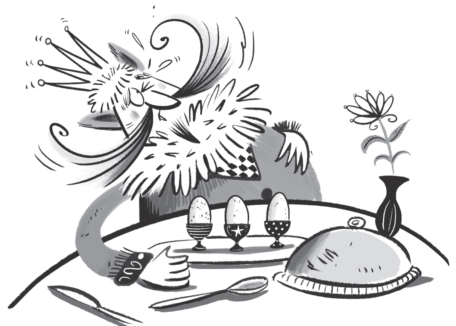 ‘I did warn you, dear,’ said Queen Mila. ‘If you will insist on sitting at the head of the table, you’ll get dripped on.’ She passed the king a napkin and he wiped his ears.