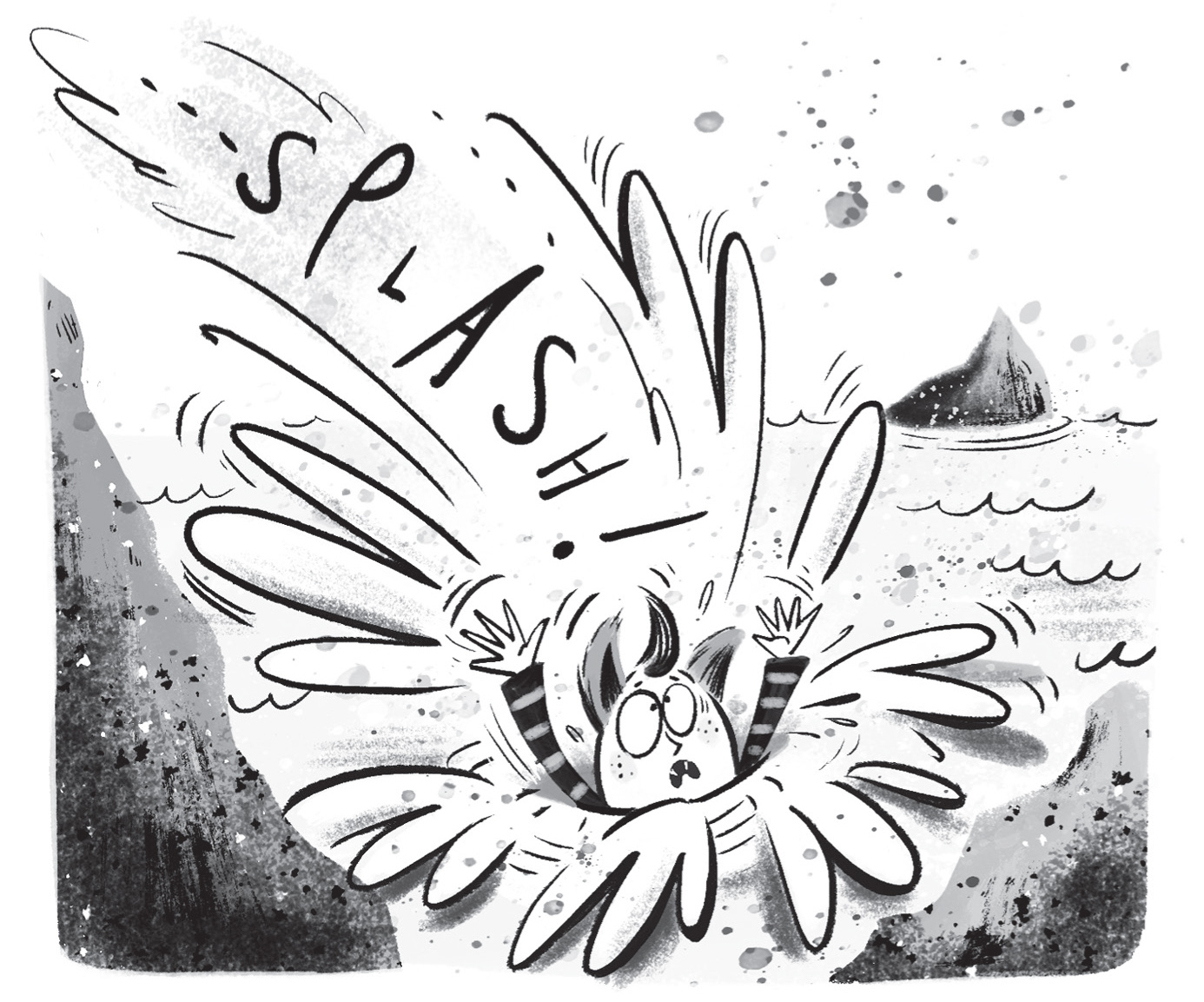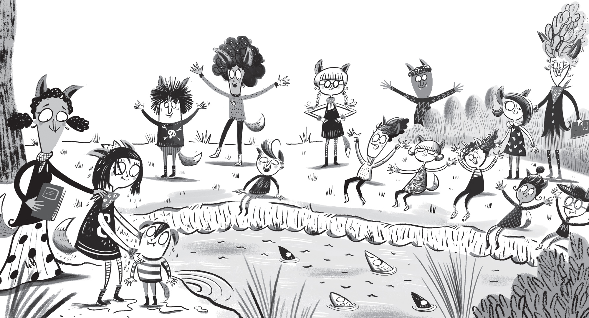 ‘Squeak!’ Jaws had landed on Lottie’s shoulder and was waving a wing. Lottie turned to look where he was pointing, and saw a teacher leading a group of tiny werewolf cubs out from the school. Each of them was carrying a piece of paper and a crayon, but the littlest one was skipping in circles, and not looking where he was going. ‘Be careful!’ the teacher warned. ‘Stay near me. Don’t go too near the lake!’ But just as she turned back round again, the smallest cub dropped his piece of paper. The wind caught it and blew it towards the shining water, and the little cub dashed after it. He slipped – he was in the water and sinking fast.