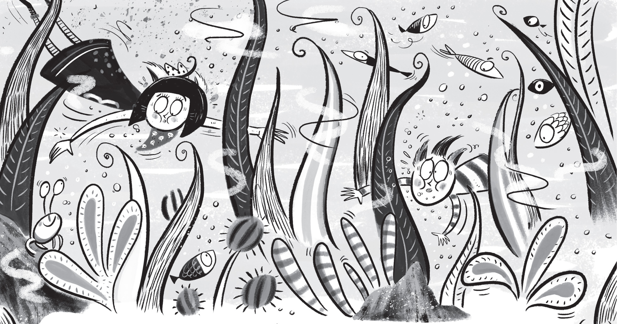There was no sign of the cub now, except for a few bubbles. Down Lottie swam, down and down. Where was he? All she could see was water weed. She looked again… and there he was!