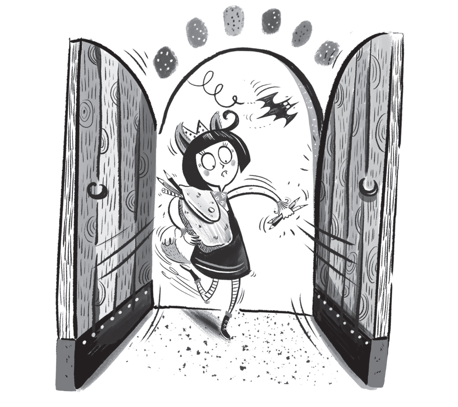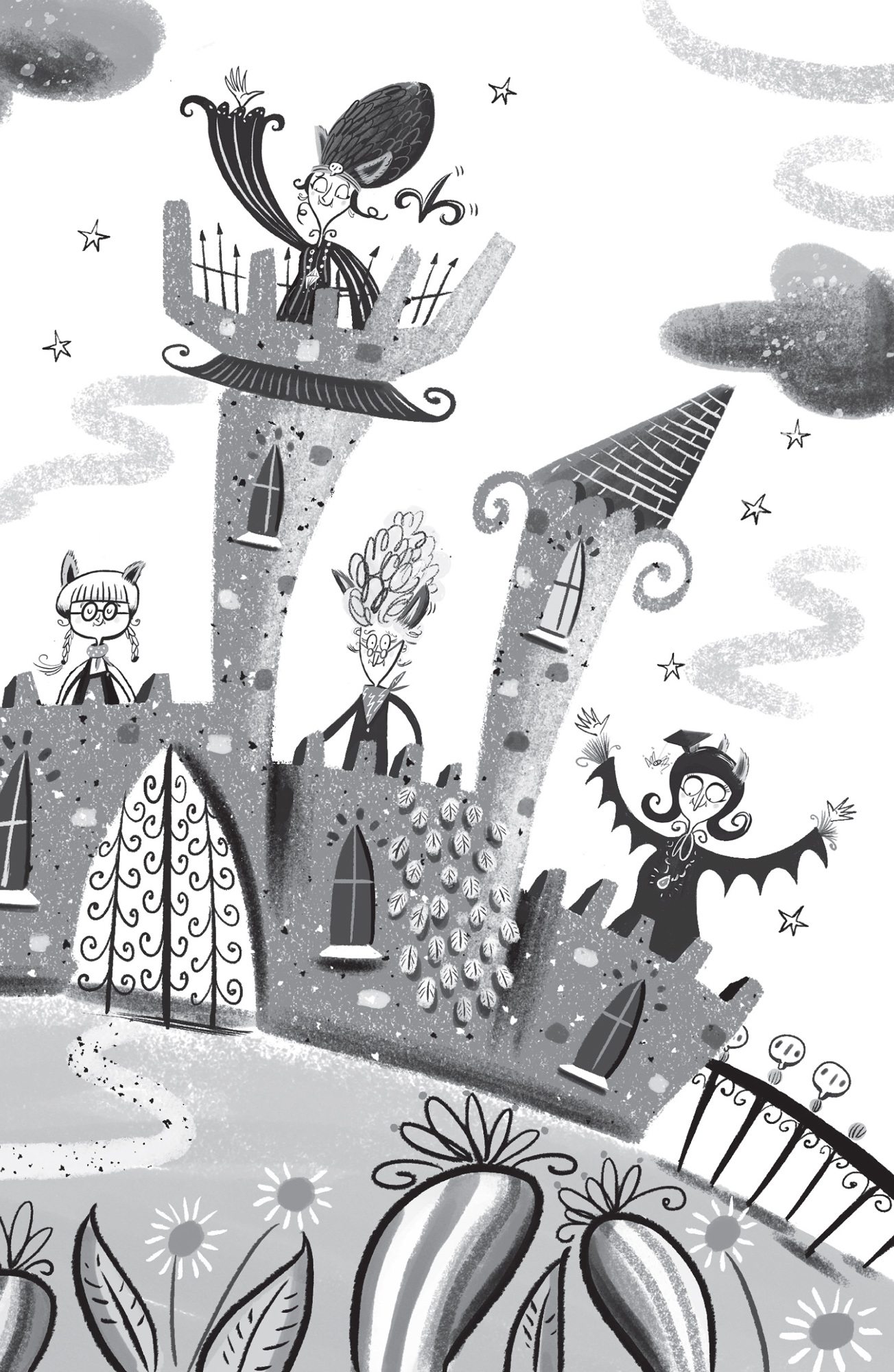 Lottie made a face at him, then stuffed her blunt pencils into her bag. ‘I’ll be off now,’ she said. ‘I don’t want to be late, not on my first day. See you later, darling Ma. Remember I won’t be back until after moonrise! Bye, Pa!’ And she whisked out of the dining hall, banging the door behind her. Jaws, her pet bat, was waiting for her on the other side, and together they hurried along the cold, dark corridor. With a heave and a tug, Lottie managed to open the creaking front door… and then they were out in the morning sunshine.